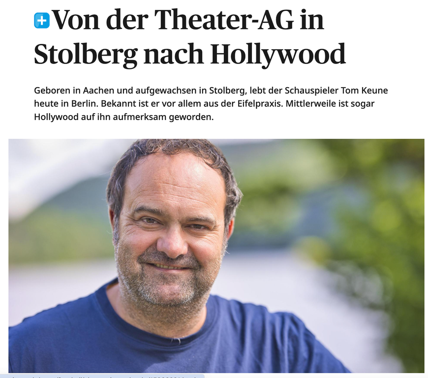 Tom Keune ist Schauspieler, hat am Theater gespielt, man sieht ihn regelmäßig im Fernsehen (Eifelpraxis) und mittlerweile spielt er auch immer wieder Rollen auf der großen Leinwand. Geboren wurde er in Aachen, aufgewachsen ist er in Stolberg. Mittlerweile lebt er in Berlin und hat seinen ersten Hollywood-Film abgedreht. Tom Keune im Interview mit Najoua Taleb.