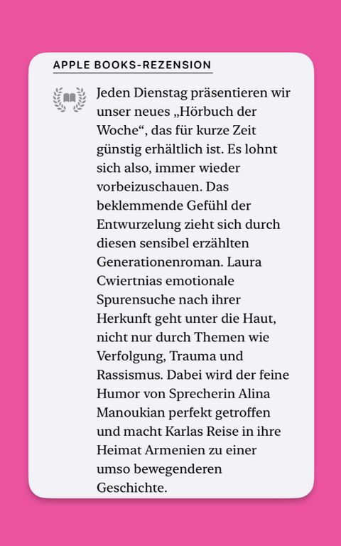 In mid-August 2024, the audiobook "On the hot street we are different" was presented by Apple Audiobooks as the "Audiobook of the week". And it became number one on the bestseller list. ..."The subtle humor of narrator Alina Manoukian is perfectly captured and makes Karla's journey to her homeland Armenia an even more moving story."